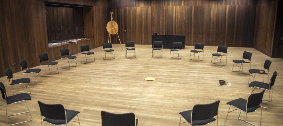 Die Sitzmeditation erfolgt auf Stühlen, der Raum wird ohne Schuhe betreten.